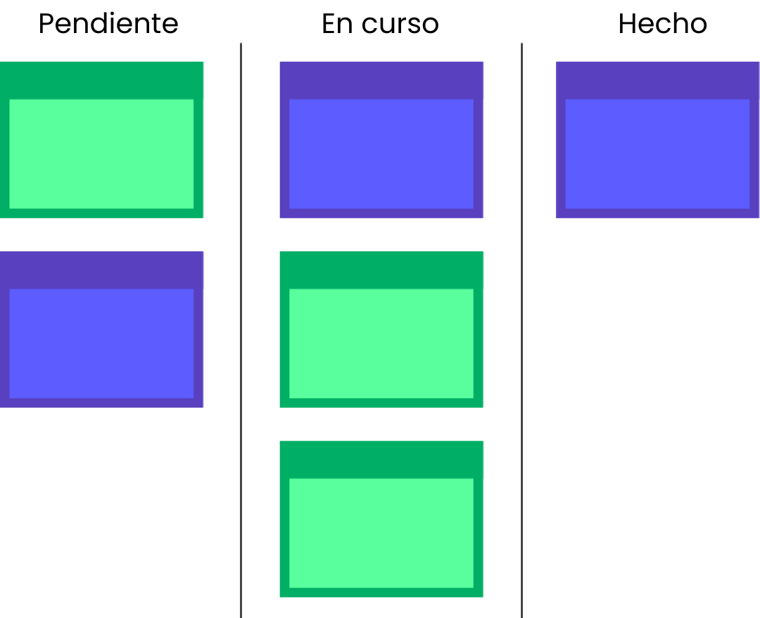 - Columnas: indican el estado de la tarea. Generalmente, se dividen en 3: “Por hacer”, “En ejecución” y “Hecho”. Pueden nombrarse según la necesidad del proyecto;